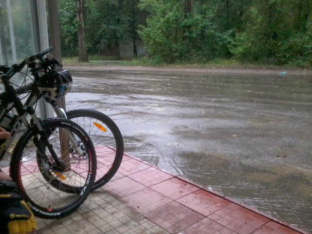 Отдохнув пару часов мы решили двигать назад погода начинала портиться, что не повышало настроения. Я умудрился упасть и как следствие потерять линзу от очков, что заметил слегка попозже. На долго нас не хватило, вернее дождь полил с такой силой, что нам пришлось спрятаться на остановку с дырявой крышей.